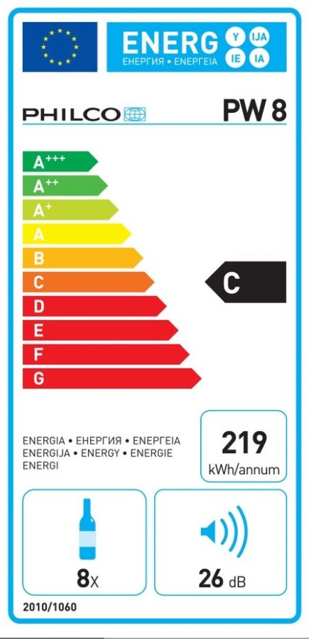 Vinotéka pro 8 lahví vína o objemu 0,75 l s energetickou třídou C.