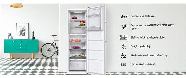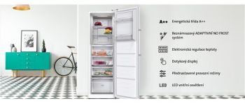 K moderním úsporným opatřením patří také beznámrazový adaptivní NO FROST systém, který zabraňuje namrzání vnitřních stěn i uložených potravin. Tím zůstává nízká nejen spotřeba mrazničky, ale dokonce i její hlučnost.