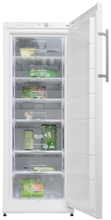Šuplíkový mrazák Philco PF 2272 s výškou 163 cm. Jeho hlavní výhodou je možnost využití až 7 zásuvek včetně zásuvky XXL, které zaručují větší přehled při ukládání potravin a hledání zmrazených potravin. I u tohoto modelu je samozřejmostí energetická třída E.