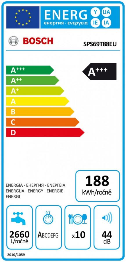 - Spotřeba vody v programu eco 50 °C: 2660 litrů/rok, na základě 280 standardních mycích cyklů. Skutečná spotřeba vody závisí na způsobu používání spotřebiče.