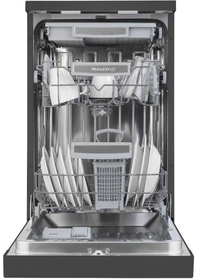 Myčka nádobí Philco PD 1046 ETDX pro 10 sad nádobí, šířky 45 cm je v designu tmavého nerezu. Myčka je vybavena třetí 3D příborovou přihrádkou, extra funkcemi Hygiena, Sušení +, Extra rychlé a EcoWash - poloviční náplň.