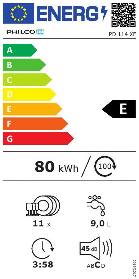 Volně stojící myčka Philco PD 114 XE šířky 45 cm, pro 11 sad nádobí v energetická třída E. 6 různých programů s rozsahem 3 teplot a systémem Variospace.