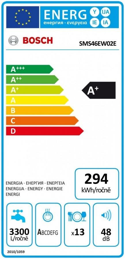 - Spotřeba vody v programu eco 50 °C: 3300 litrů/rok, na základě 280 standardních mycích cyklů; skutečná spotřeba vody závisí na způsobu používání spotřebiče.