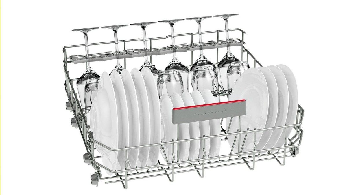 Koše VarioFlex a příborová zásuvka VarioDrawer: systém košů VarioFlex je zárukou vysoké flexibility a pohodlí při manipulaci s koši. To je zajištěno osmi pohyblivými prvky v horním koši (držák na sklo, sklopné trny a etažéry). Díky červeně označeným úchytům vždy hned vidíte, kde a jak můžete přizpůsobit koše podle druhu vkládaného nádobí. Spodní koš nabízí dokonce devět pohyblivých prvků (vyšší držák na sklo vzadu, sklopné trny a etažéry). Sklopné trny navíc nabízejí zvláštní ochranu a stabilitu nádobí díky zaobleným koncům. A díky madlům z nerezu je vše pohodně a rychle dostupné.