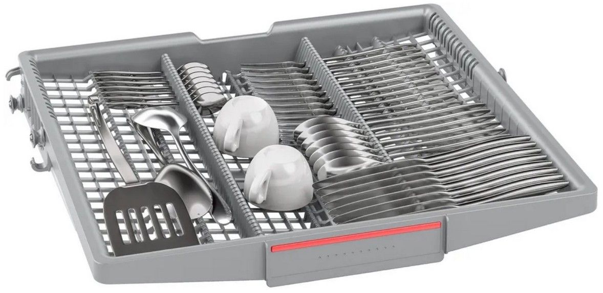 Koše VarioFlex a příborová zásuvka VarioDrawer: systém košů VarioFlex je zárukou vysoké flexibility a pohodlí při manipulaci s koši. To je zajištěno osmi pohyblivými prvky v horním koši (držák na sklo, sklopné trny a etažéry). Díky červeně označeným úchytům vždy hned vidíte, kde a jak můžete přizpůsobit koše podle druhu vkládaného nádobí. Spodní koš nabízí dokonce devět pohyblivých prvků (vyšší držák na sklo vzadu, sklopné trny a etažéry). Sklopné trny navíc nabízejí zvláštní ochranu a stabilitu nádobí díky zaobleným koncům. A díky madlům z nerezu je vše pohodně a rychle dostupné. - Silence on demand: potlačení hluku až na 30 minut prostřednictvím aplikace Home Connect.