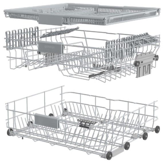 - Spodní koš: Široká mřížka koše, Sklopné/dělitelné zadní držáky talířů, Koš na příbory