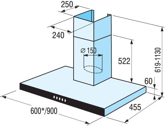 Komínový odsavač se 3 rychlostmi výkonu, zpětnou klapkou a možností recirkulace. Výkon odsavače 581 m3/h.