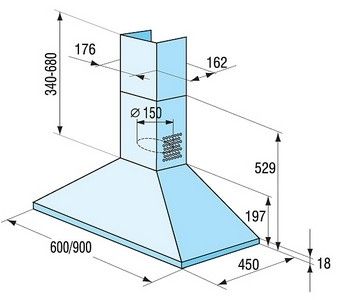Komínový odsavač se 3 rychlostmi výkonu, zpětnou klapkou a možností recirkulace. Výkon odsavače 395 m3/h.