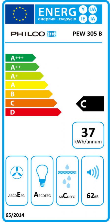 Komínový odsavač PEW305B, provedení černé sklo s tlačítkovým ovládáním a LED osvětlením, třída energetické účinnosti C