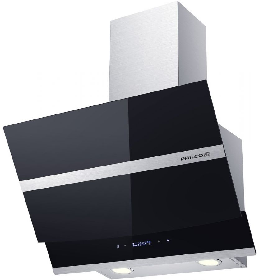 Komínový odsavač par Philco PEW 726 B, skleněný černý design s nerezovým pruhem, nerezový komín, třída energetické účinnosti A.