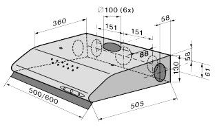 Podstavný odsavač na stěnu se 3 rychlostmi výkonu, s odtahem nebo možností recirkulace. Výkon odsavače 320 m3/h.
