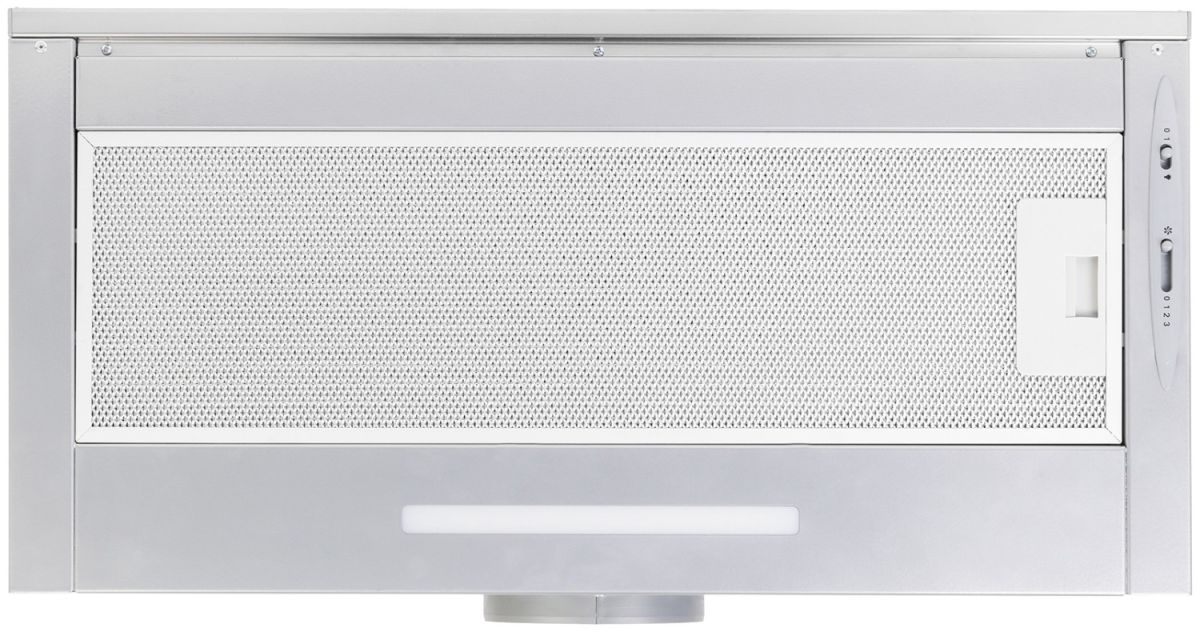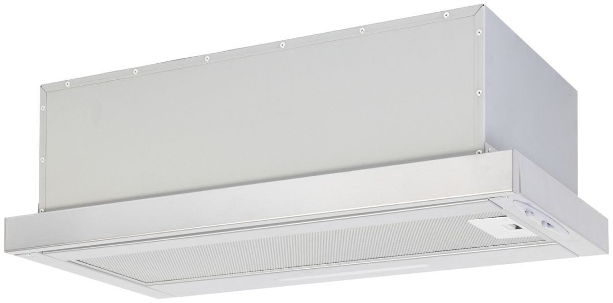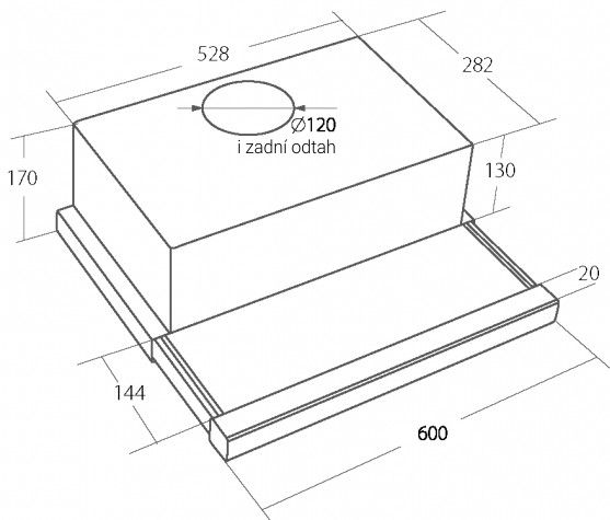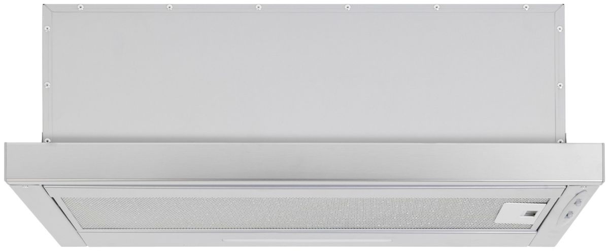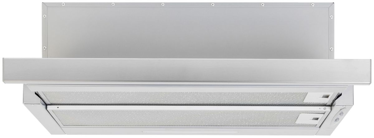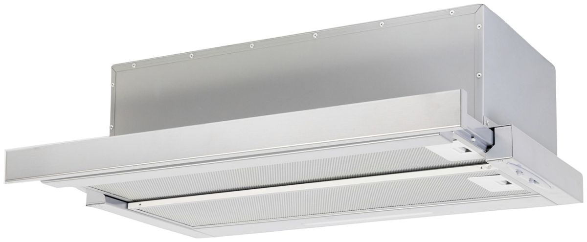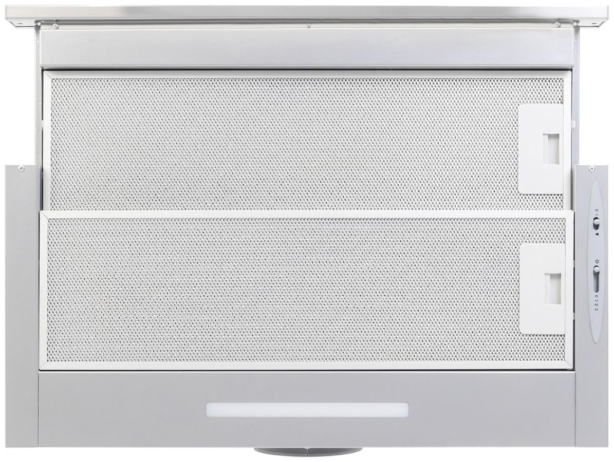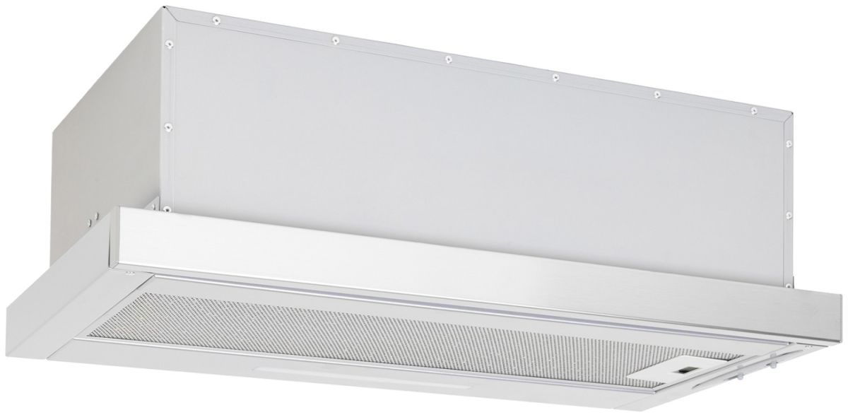 Vestavná digestoř výsuvná, jediná na trhu s odtahem dozadu nebo nahoru (oba 120 mm), šíře 60 cm, bílá s nerez lištou, max. výkon 338 m³/h (15 Pa), hlučnost Lw 56 – 71 dB(A), 3 rychlosti, odsávací jednotky mají individuálně vyvažovanou turbínu, motory jsou opatřeny vratnými tepelnými pojistkami (při přetížení motoru, po jeho vychladnutí opět sepne), mechanické posuvné ovládání, kovové sendvičové tukové filtry, které lze mýt v myčce, možnost práce v odtahovém i recirkulačním režimu, Výbava: úsporné LED osvětlení 1 × 2,8 W (LED pásek), zpětná klapka zdarma