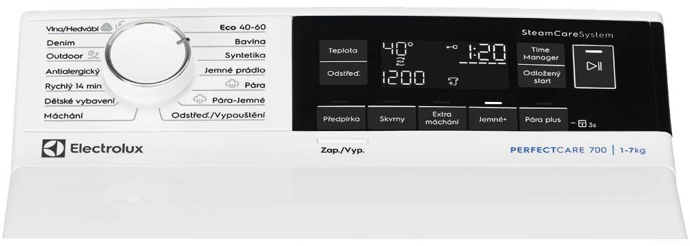 - Funkce: Temp Selection, výběr otáček, předpírka, Stain, pouze máchání, Soft Plus, Steam Plus, Delay, Time Manager, start/pauza