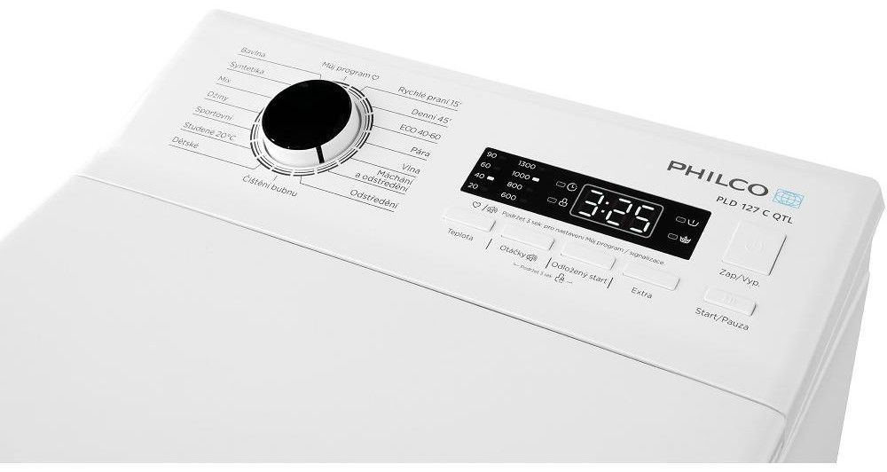Vrchem plněná pračka Philco PLD 127 CQTL na 7 kg prádla, nabízí 16 programů, ovládací panel v češtině, LED displej a 1200 otáček/min.