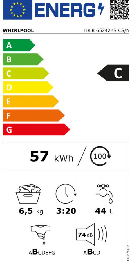 Pračka s vrchním plněním s max. kapacitou 6,5 kg a energetickou třídou C.