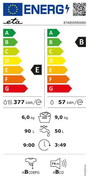 Spotřeba energie při praní a sušení: 377 kWh/100 cyklů