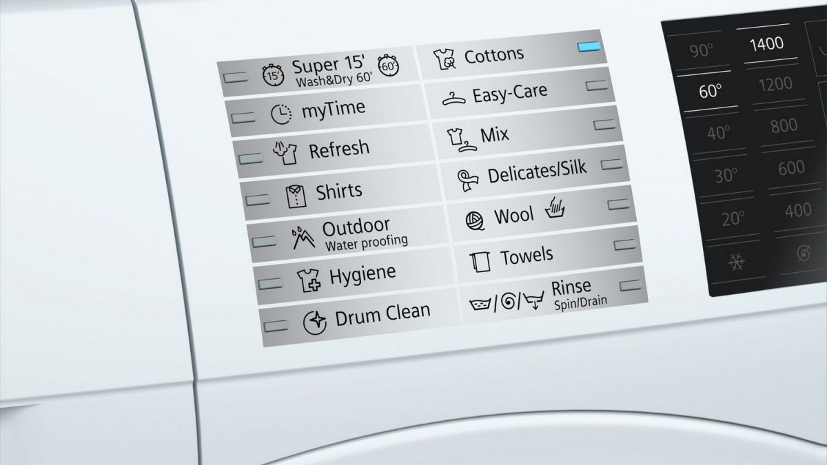- Speciální programy pro praní: hygiena, čištění bubnu s funkcí připomenutí, super 15', ručníky, košile/halenky, mix, myTime, outdoor/impregnace, máchání/odstředění/odčerpání