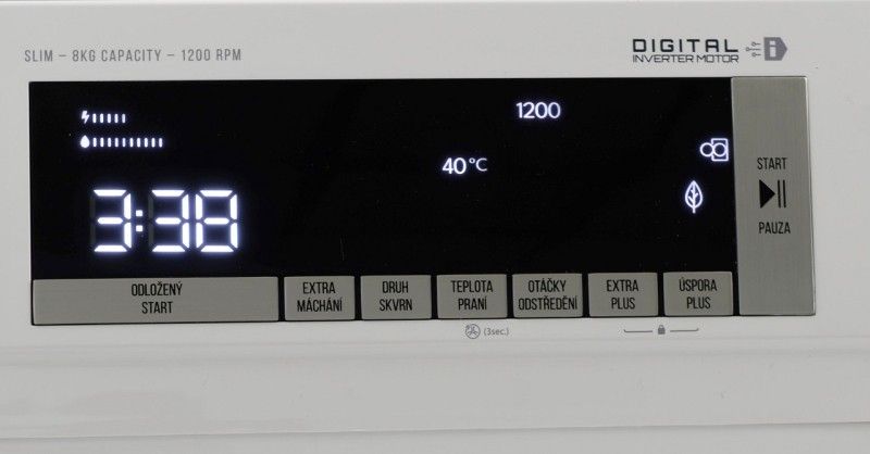 - Programy (české popisky na ovládacím panelu): eko 40 - 60, bavlna, syntetika, odstranění skvrn, barevné/lůžkoviny, vlna/ruční praní, přikrývky, hygiena, odstředění/vypuštění, máchání, košile/záclony, rychlý 59 min 60oC, rychlý bavlna 44 min 40oC, rychlý 29 min 30oC, super rychlý 12 min