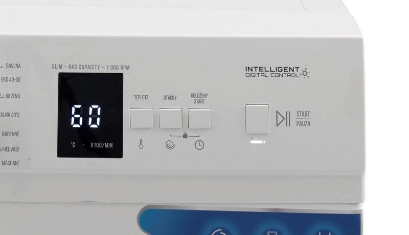 - Programy (české popisky na ovládacím panelu): bavlna, eko 40 - 60, bavlna s předpírkou, bavlna 20 °C, barevné, vlna, máchání, antialergický, odstředění / vypouštění, ruční praní, sportovní, mix, džíny / tmavé oděvy, rychlý 60 min, rychlý 15 min