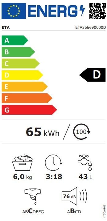 Pračka s předním plněním s max. kapacitou 6 kg a energetickou třídou D.
