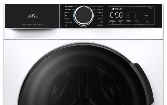 - Programy (české popisky na ovládacím panelu): rychlý 15’, rychlý 59’, ECO 40 - 60, vlna, lůžkoviny, džíny, odstředění, čištění bubnu, PET, bavlna 20 °C, dětské, mix, bavlna, syntetika, můj program