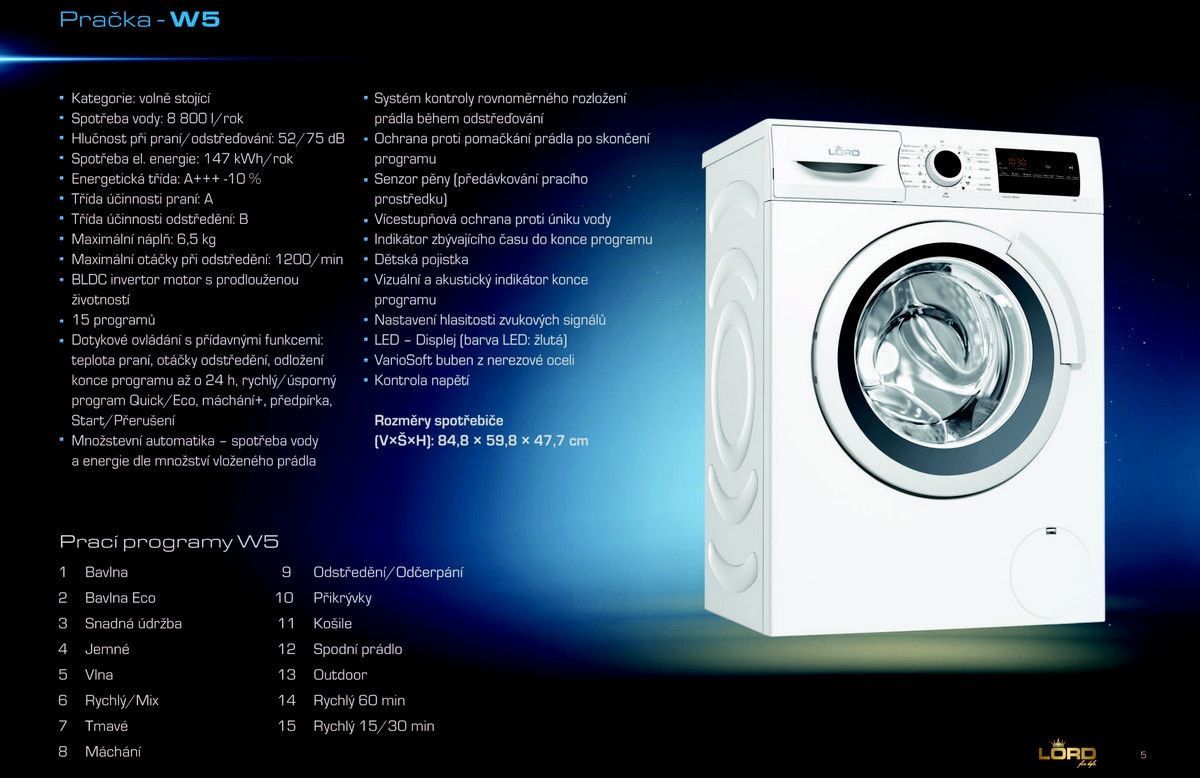 - Pračku Lord W5 charakterizuje tichý chod, takže můžete prát i v noci. Její hlučnost je pouze 52 dB.