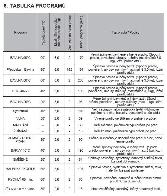 Programy: Bavlna s předpírkou, Smíšené, Syntetika, Sport, Košile, Vlna, Ruční praní, Máchání, Odstřeďování, Bavlna 90°, Eco 20°, Denní 60°, Rychlý 15 min., Bavlna 60°, Bavlna 40°