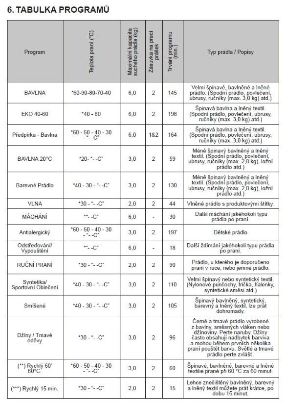 Programy praní: Bavlna, Bavlna s předpírkou, Vlna, Ruční praní, Máchání, Bavlna 20°, Odstředění + vypouštění, Sportovní oděvy, Rychlý 15 min., Antialergický, Džíny / Tmavé oděvy, Rychlý 60', Barevné prádlo, Eco 40-60, Mix