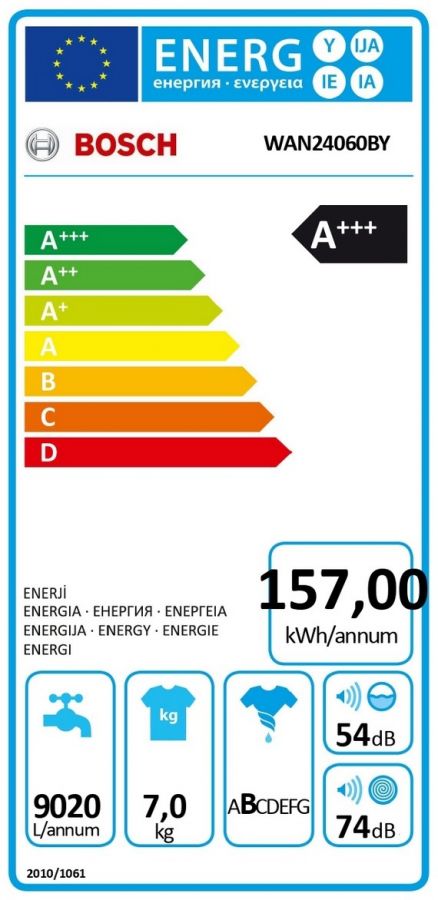 - Roční spotřeba energie 157 kWh na základě 220 standardních pracích cyklů v programech pro bavlnu při 60 °C a 40 °C s celou a částečnou náplní a spotřeby v úsporných režimech; skutečná spotřeba energie bude záviset na způsobu použití spotřebiče