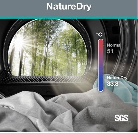 Technologie NatureDry posouvá šetrné sušení nad úroveň běžných sušiček s tepelným čerpadlem. Pracuje při mimořádně nízké teplotě pouhých 33,8 °C, což je přibližně o 37%* méně než při standardním sušení. Díky tomu lépe chrání barvy a zachovává měkkost i přirozený pocit jemných materiálů. Sušení při nízké teplotě se blíží sušení na čerstvém vzduchu, jen rychleji a bez závislosti na počasí.*Na základě testů laboratoří SGS. Porovnání sušičky s tepelným čerpadlem na programu Mix s a bez funkce NatureDry. Průměrná teplota v prádle bez NatureDry: 53,8 °C. Průměrná teplota v prádle s NatureDry: 33,8 °C. Jednotlivé výsledky se mohou lišit.
