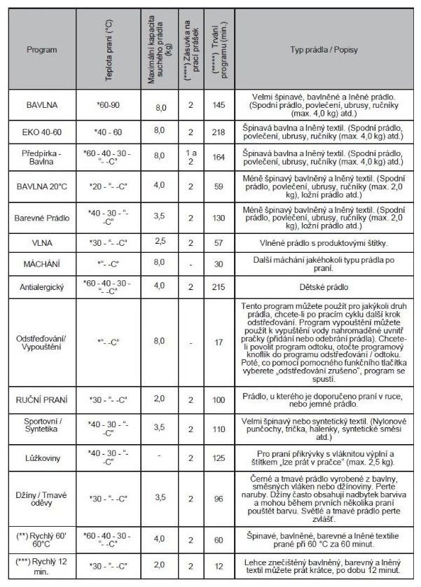 Programy: Bavlna, Bavlna s předpírkou, Vlna, Ruční praní, Máchání, Bavlna 20°, Odstředění + vypouštění, Sportovní oděvy, Rychlý 12 min., Lůžkoviny, Antialergický, Džíny / Tmavé oděvy, Rychlý 60', Barevné prádlo, Eko 40-60