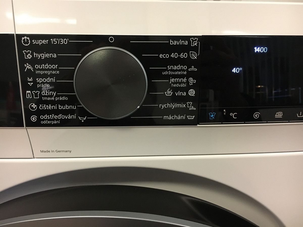 - Speciální programy: hygiena, čištění bubnu s funkcí připomenutí, džíny/tmavé prádlo, odčerpání/odstředění, mix, máchání, super 15'/30', spodní prádlo, Outdoor/impregnace