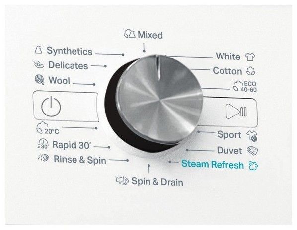 - Programy: Bavlna 40°, Bavlna 60°, Smíšené prádlo 40°, Syntetika 30, Vlna, Rychlé praní 30', Povlečení, Jemné prádlo, Sport, Praní + odstřeďování, Odstřeďování + odčerpávání, Eco 40-60, 20°C, Mix, Syntetika, Bavlna, Osvěžení párou 20'