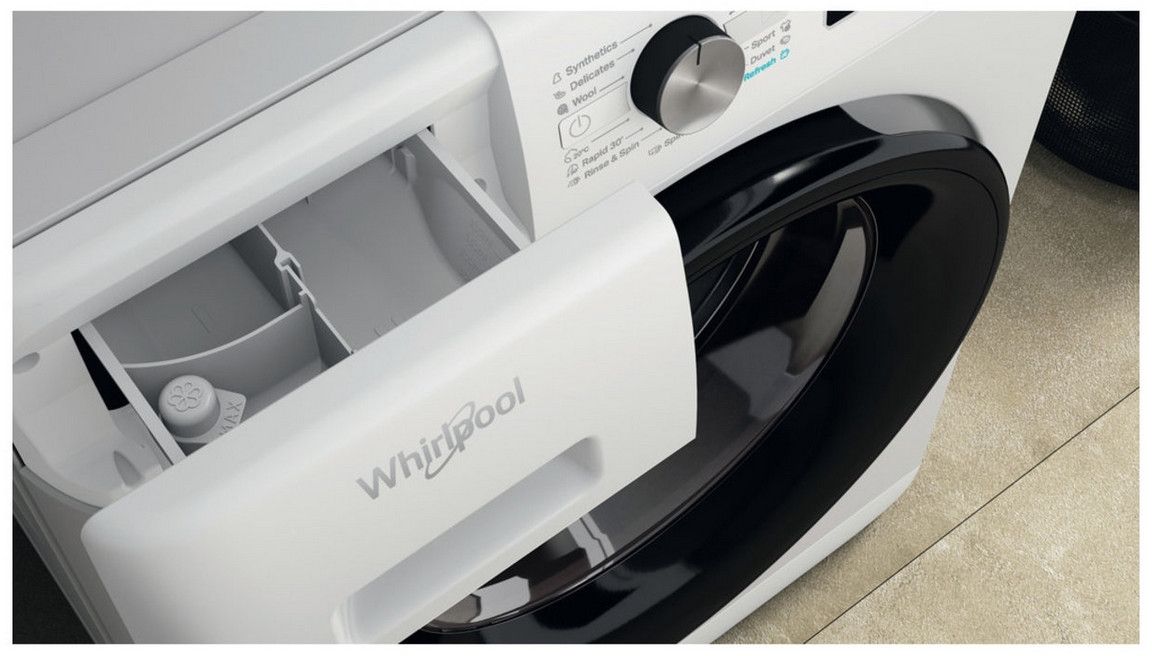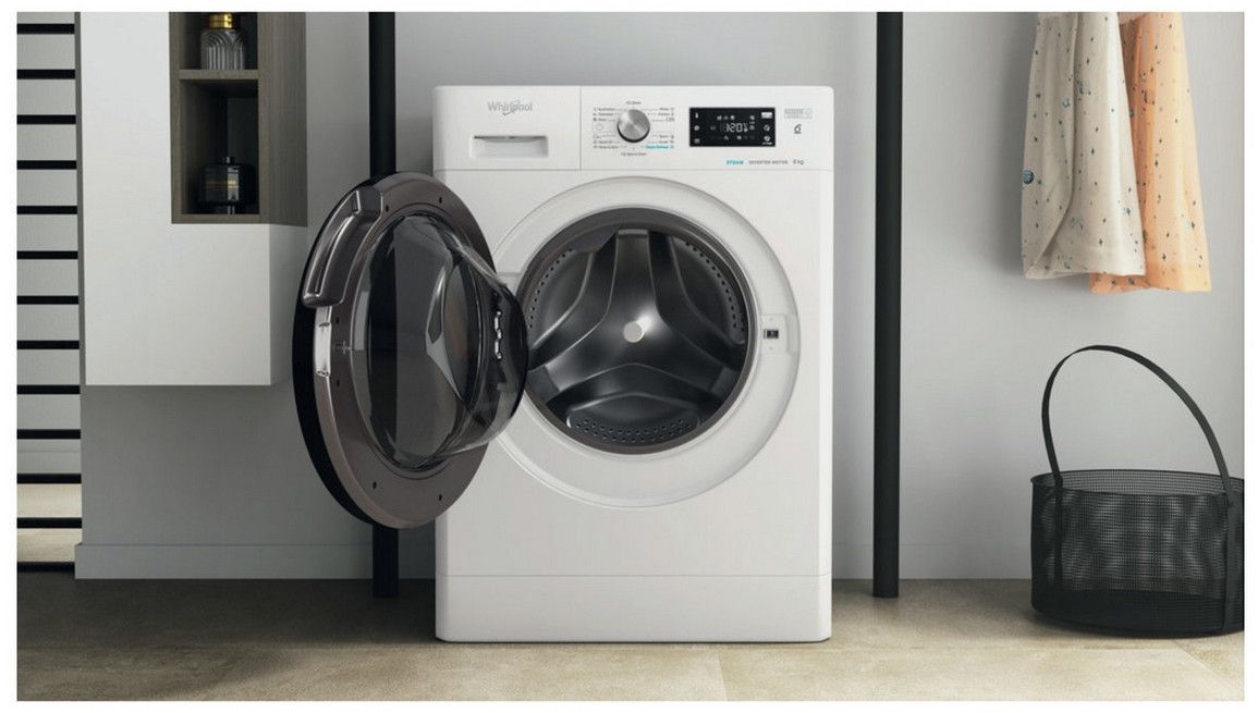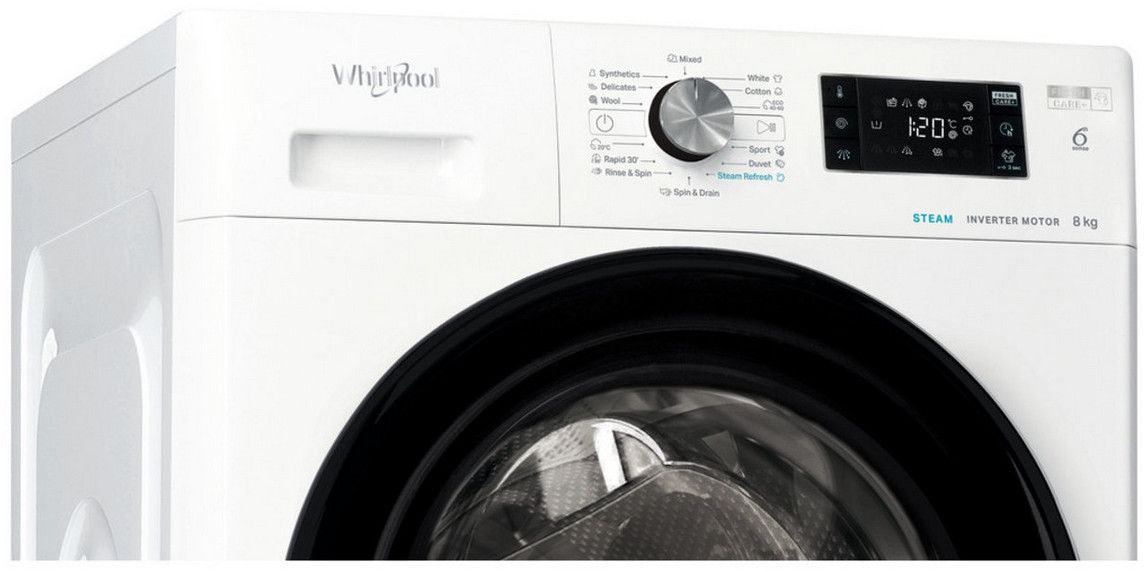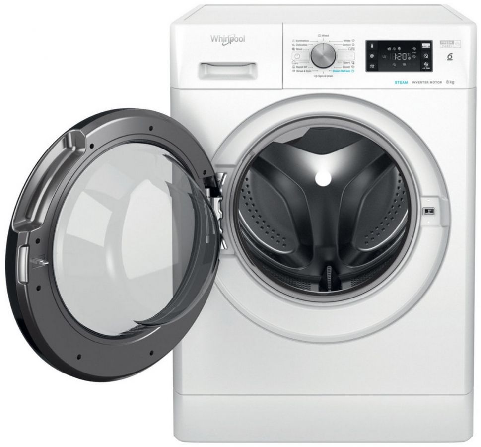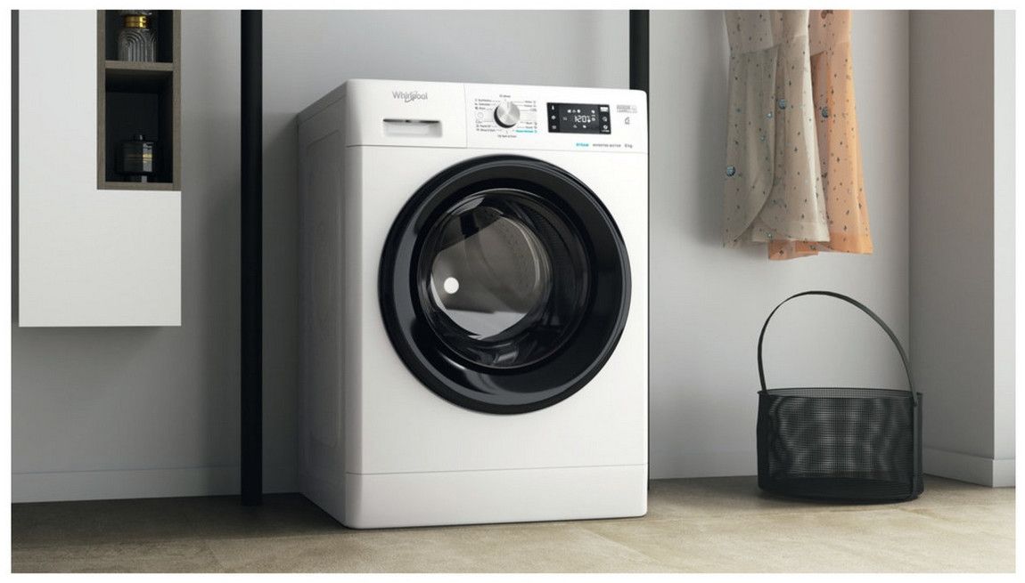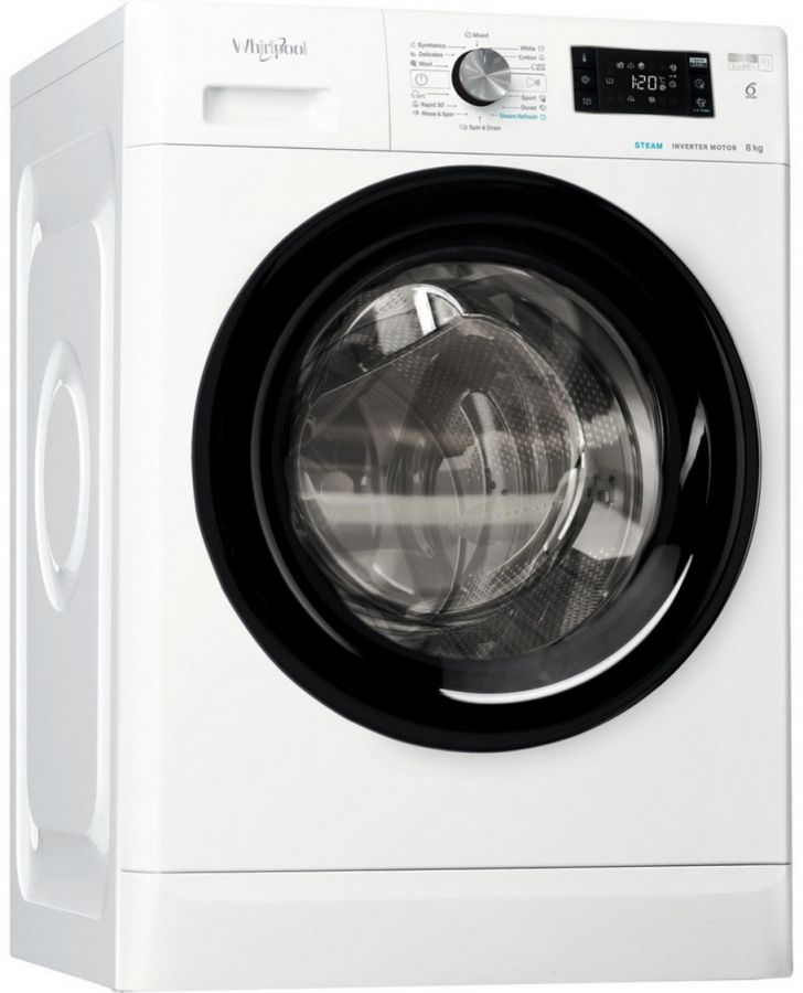 Whirlpool FreshCare+ FFB 8258 BV EE je zepředu plněná pračka v energetické tříde B s velkým displejem pro zobrazení funkcí, teploty a času.