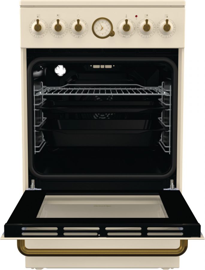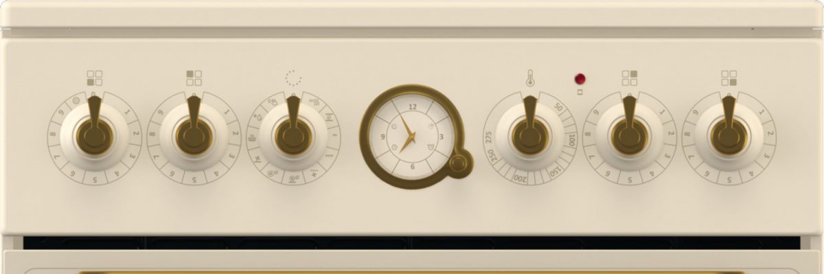 Klasický analogový design elektronického programovatelného časovače je jedním z ozdobných prvků této řady. Je vybaven hodinovým a minutovým zapisovačem a také umožňuje programování opožděného času začátku pečení a konce doby pečení. Hodiny indikují akustický signál ukončení procesu pečení. Klasický design hodin s ručičkami a orámováním ve staro-zlaté barvě doplňuje celkový design trouby.