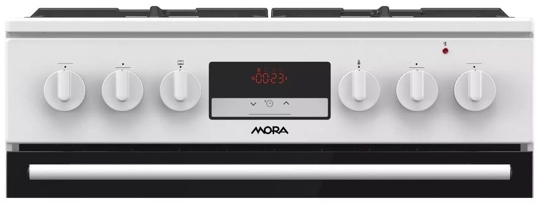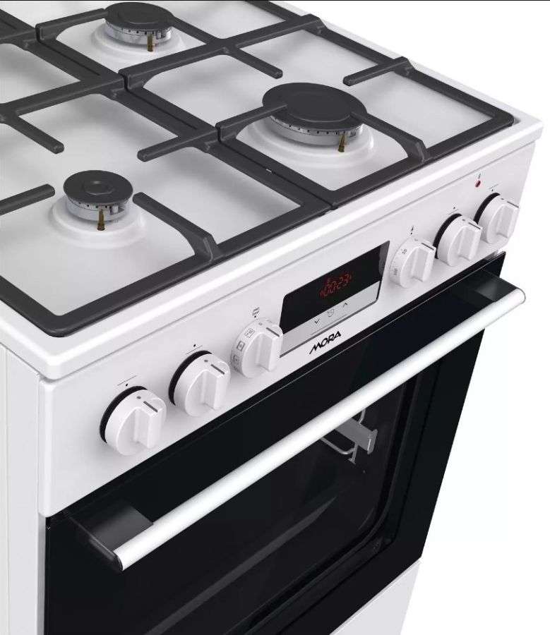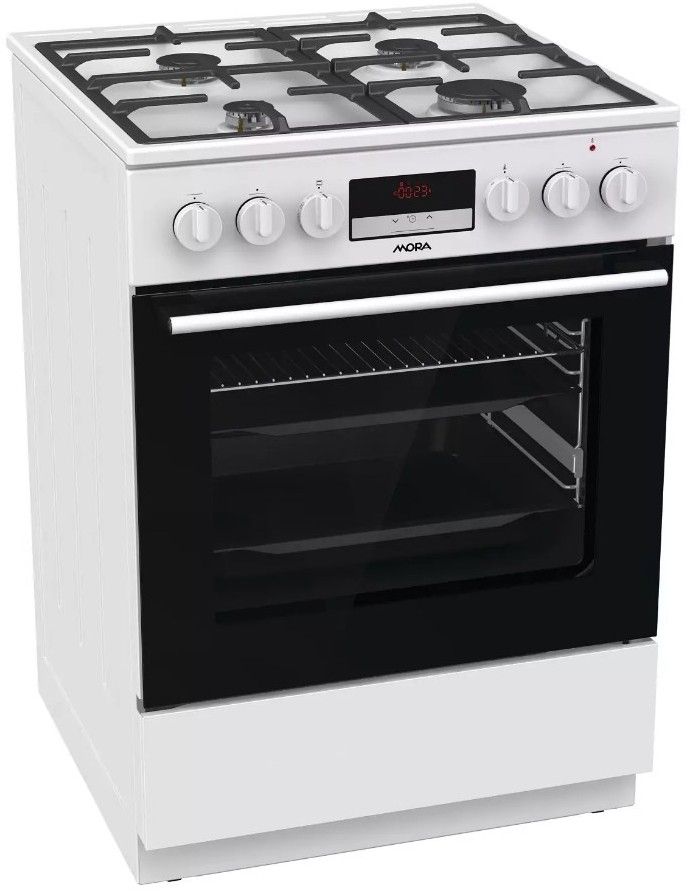 Kombinovaný sporák Mora K 8668 B1W6, v šířce 60 cm, v bílém provedení s multifunkční troubou v objemu 71 l Vás překvapí energeticky úspornou třídou A. Plynové hořáky s pojistkami STOP GAS a integrovaným zapalováním jsou kryté dvoudílnou mřížkou STABIL PLUS, která zajišťuje bezpečný posun nádobí ve všech směrech. Díky digitálnímu časovému spínači s hodinami se Vám již nikdy nespálí oběd, tato praktická funkce Vám přinese mnoho užitku. Lze nastavit odložený start a ukončení pečení, pouze ukončení pečení a minutka, samozřejmostí je nastavený aktuální čas. Disponuje funkcí páry, kterou ocení především příznivci zdravé výživy. Připravíte s ní jídla rychle a šetrně, takže si zachovají maximum vitamínů a stopových prvků. Dále je trouba vybavená 11 pečicími programy, které jsou navržené přesně podle potřeb konkrétních jídel. Vykouzlíte například výbornou pizzu jako z italské restaurace (program Pizza), pomalu upečete pečínku a efektivně rozmrazíte hotové porce jídla. Pokud si rádi pochutnáváte na hranolkách nebo kuřecích nugetách, ale nedopřáváte si je tak často kvůli vysoké kalorické hodnotě, můžete také zkusit program pro horkovzdušné fritování bez tuku. Hotovky většinou volíme tehdy, když nás tlačí čas. Zvykli jste si, že předehřátí trouby trvá celou věčnost? Na to teď zapomeňte. Tato trouba se předehřeje na 200 ˚C do 5 minut, což je mnohem rychleji, než bývá zvykem. Nové bezpečné závěsy dvířek zaručují bez Vaší asistence velmi tiché a šetrné zavírání dvířek trouby. Pro zvýšení komfortu obsluhy je trouba vybavená teleskopickým výsuvem, které umožní bezpečnou manipulaci s připravovaným jídlem, aniž byste ho museli z trouby vytáhnout. Ve spodní části sporáku je praktický úložný prostor, do kterého snadno uložíte příslušenství v podobě roštu, mělkého plechu a MAXI pekáče XXL o objemu až 8 l. Perfektní vyčištění vnitřního prostoru po každém pečení zajistí funkce ECO CLEAN, díky které odstraníte i větší nečistoty bez nutnosti použít čisticí prostředek.