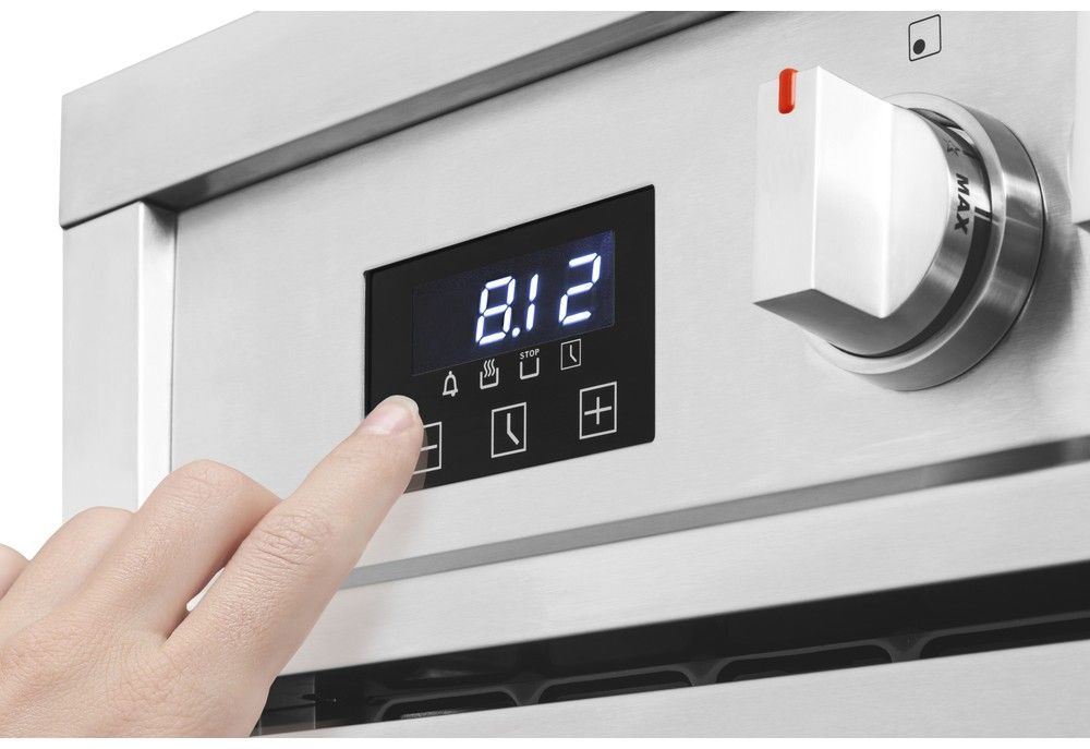 Časovač Vám poskytne pohodlné funkce automatického nastavení např. (koncový čas, čas pečení, teploty a režim pečení). Časovač lze nastavit na 23 hod 59 minut. Osvětlení prostorů trouby zajišťují dvě světla trouby o výkonu 2x25 W. Sporák je vybaven všemi detaily s bohatým příslušenstvím: teleskopický pojezd, grilovací rožeň, rošt, skleněný poklop a trysky pro PB.
