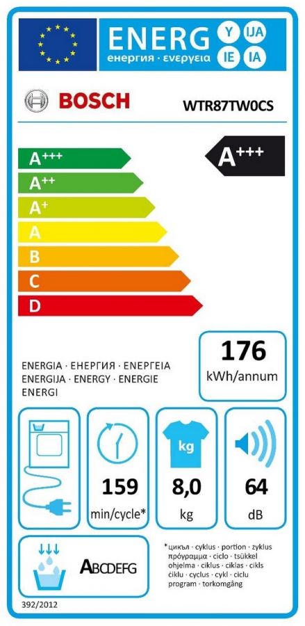 - Třída účinnosti sušení: A na stupnici od G (nejméně účinný) do A (nejúčinnější)