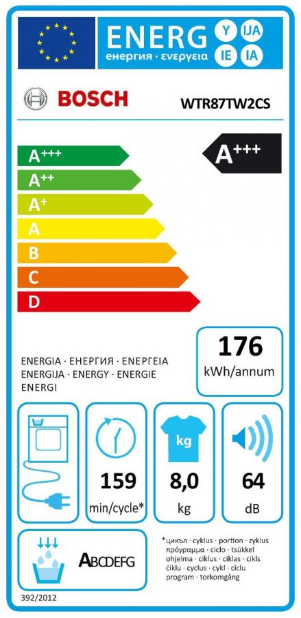 - Třída účinnosti sušení: A na stupnici od G (nejméně účinný) do A (nejúčinnější)