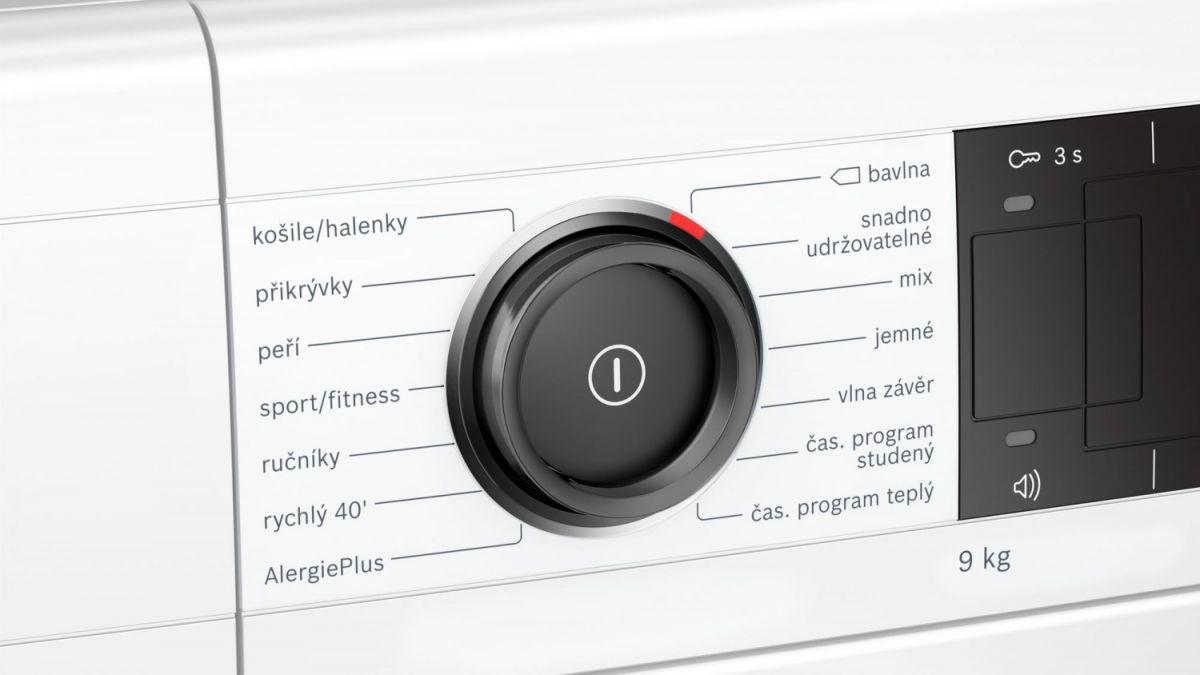 - Jmenovitá kapacita standardního programu pro bavlnu při plné náplni: 9 kg bavlněného prádla