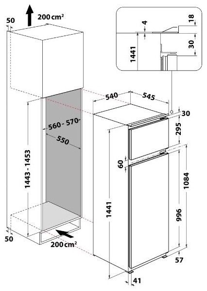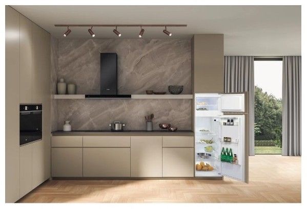 Vestavná chladnička s mrazničkou nahoře s energetickou třídou E o celkovém užitném objemu 218 l. Objem chladničky 178 l a objem mrazničky 40 l