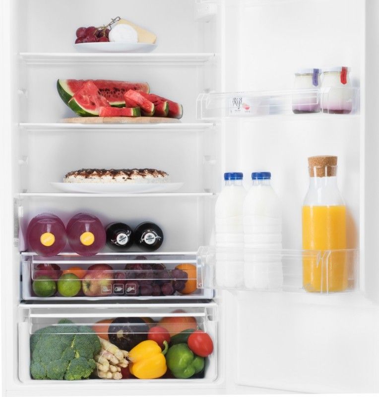 Kombinovaná chladnička v bílé barvě, s možností změny otevírání dveří, která se vestaví do korpusu skříňky. Interiér je osvětlen moderním LED světlem, které nejenže uspoří energii, ale má především výbornou svítivost.