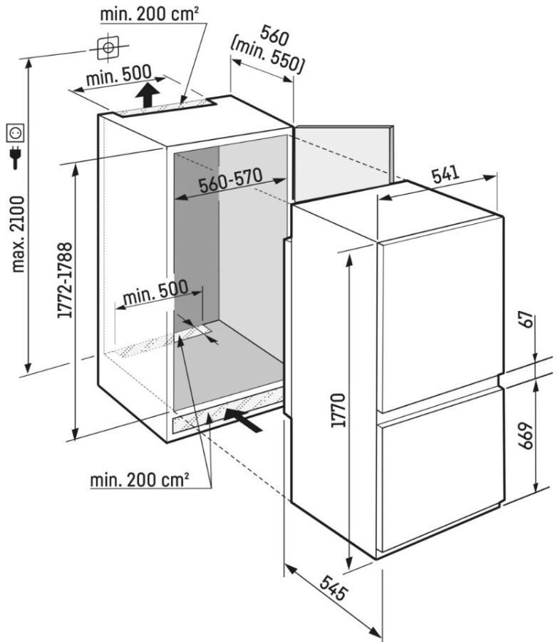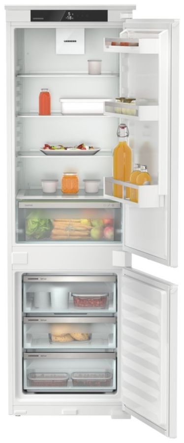 Vestavná kombinovaná chladnička o celkovém užitném objemu 253 l. Objem chladničky 183 l a objem mrazničky 70 l.