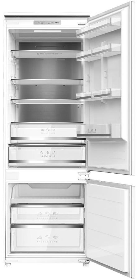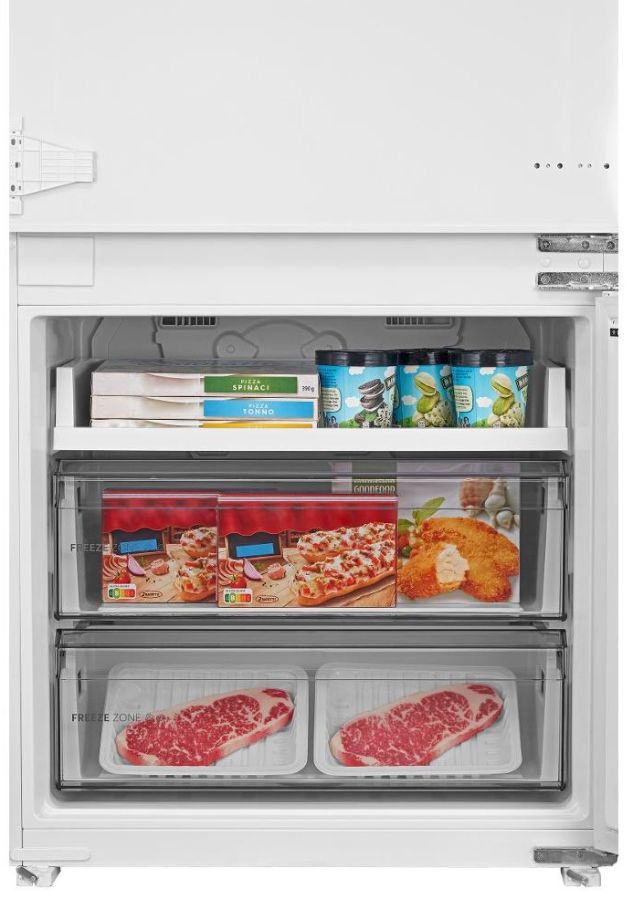 Vestavná kombinovaná chladnička o celkovém užitném objemu 403 l. Objem chladničky 298 l a objem mrazničky 105 l.