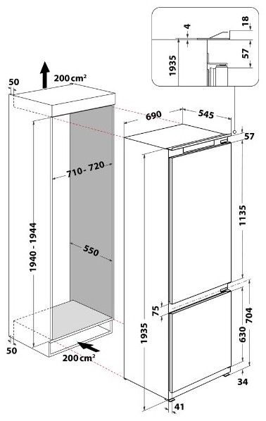 Vestavná kombinovaná chladnička s energetickou třídou E o celkovém užitném objemu 400 l. Objem chladničky 299 l a objem mrazničky 101 l.
