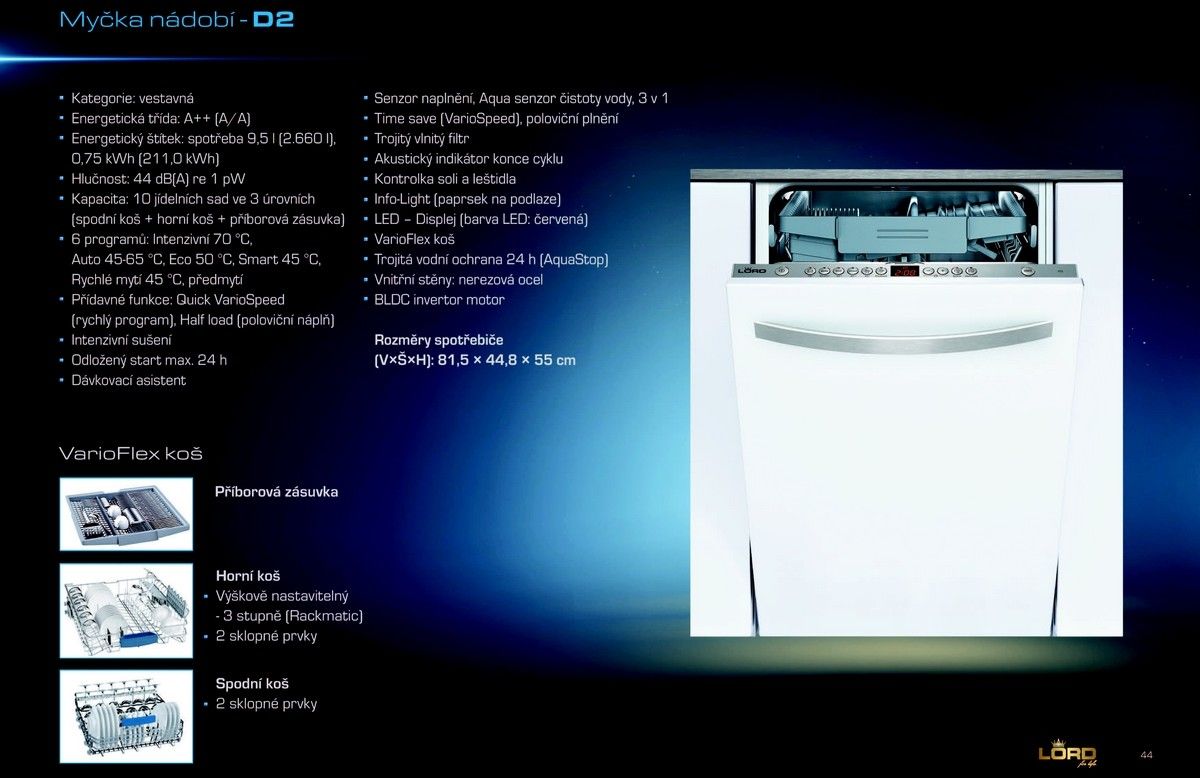 Kapacita: 10 jídelních sad ve 3 úrovních (spodní koš + horní koš + příborová zásuvka)