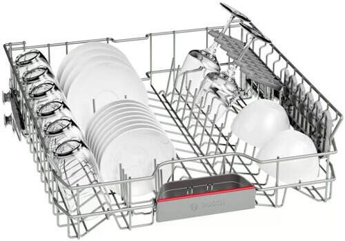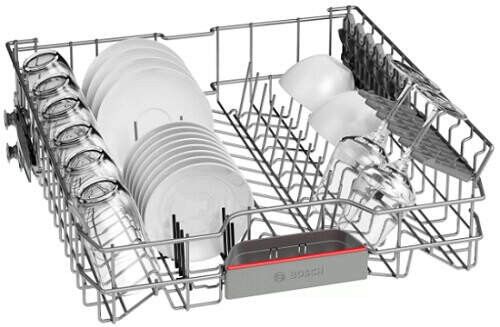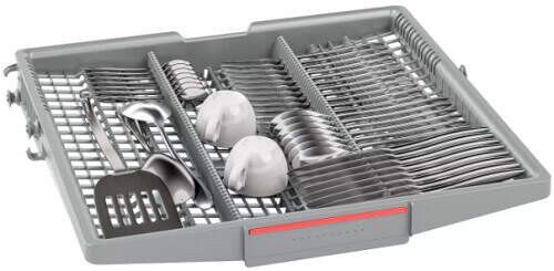 Koše VarioFlex a příborová zásuvka VarioDrawer: systém košů VarioFlex je zárukou vysoké flexibility a pohodlí při manipulaci s koši. To je zajištěno osmi pohyblivými prvky v horním koši (držák na sklo, sklopné trny a etažéry). Díky červeně označeným úchytům vždy hned vidíte, kde a jak můžete přizpůsobit koše podle druhu vkládaného nádobí. Spodní koš nabízí dokonce devět pohyblivých prvků (vyšší držák na sklo vzadu, sklopné trny a etažéry). Sklopné trny navíc nabízejí zvláštní ochranu a stabilitu nádobí díky zaobleným koncům. A díky madlům z nerezu je vše pohodně a rychle dostupné.