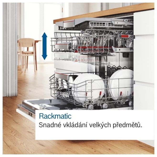 Díky systému Rackmatic může být výška horního koše jednoduše přenastavena až o 5 cm. A můžete to udělat, i když je koš plně naložený. To znamená ještě více možností nastavení a tím maximální flexibilitu.