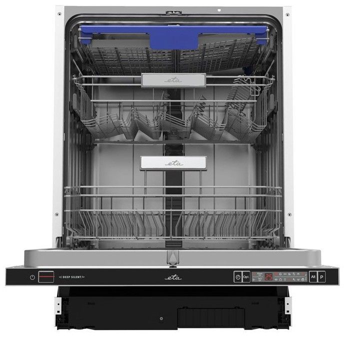 Myčka ETA pohodlně pojme až 14 sad nádobí a nechybí zde ani variabilní příborová zásuvka v horní části myčky. Díky elektronickému ovládání a LED displeji si můžete vybrat až z 9 programů: 3 v 1, auto, intenzivní, univerzální, EKO, sklo, 90 min, rychlý program, oplach. Využít můžete i doplňkové funkce Express, Extra sušení nebo oblíbený odložený start.