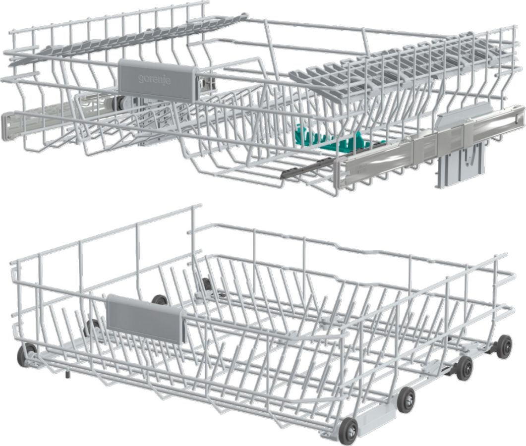 Koše jsou vybaveny zvýrazněnými pohyblivými prvky a přizpůsobitelným rozložením koše pro snadné nakládání. Opravdu jednoduchý dvouúrovňový systém nastavení koše vám umožní umístit i ty největší hrnce a talíře. Stojan na talíře ve spodním koši lze snadno složit. Příbory lze perfektně organizovat na speciálním tácu, kde jsou umístěny odděleně pro dokonalé výsledky čištění a sušení. Každý detail je pečlivě navržen pro co nejjednodušší manipulaci.